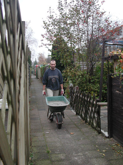 Honderd meter lopen met een kruiwagen met een klein beetje beton.