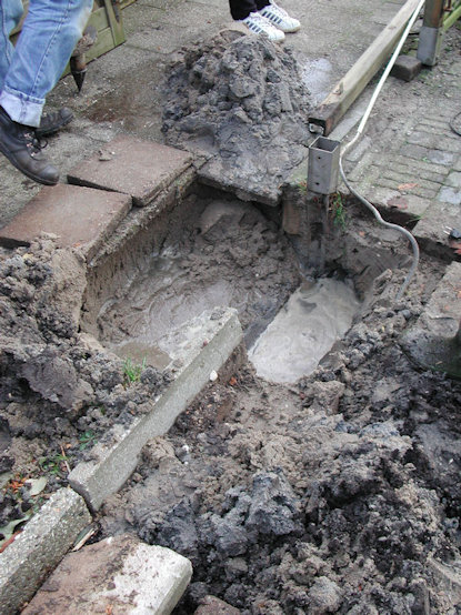 Daar moet ook een paal ingedraaid worden, helaas eerst begraven tegels uit de grond halen.