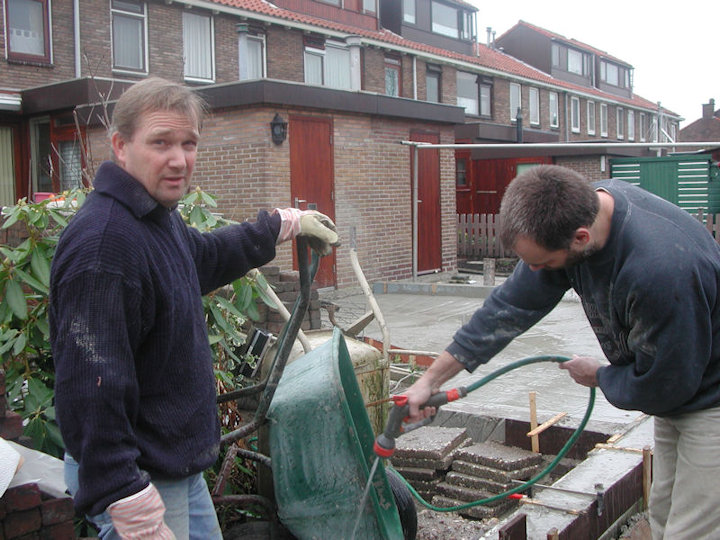 Het betonstorten is gedaan, nu nog de spullen schoonmaken.