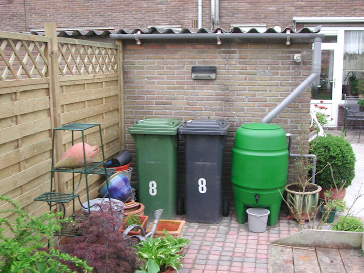 Afvalcontainers en de regenton.